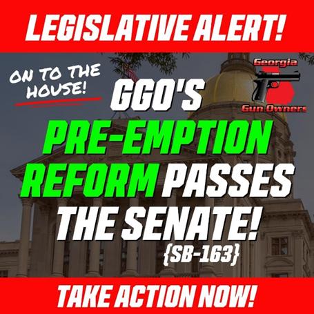 Georgia Gun Owners has been working all session to get this bill through the first chamber, but it would never have happened without your calls and emails to your State Senators, telling them to get on board.